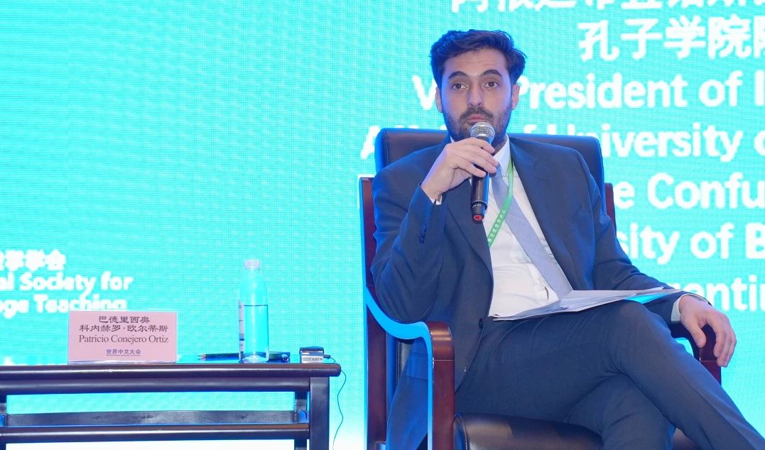 分论坛二由华东师范大学副校长顾红亮和阿根廷布宜诺斯艾利斯大学副校长、孔子学院院长巴德里西奥·科内赫罗·欧尔蒂斯主持。中国国际中文教育基金会数字化与创新部副主任刘英佳、北京邮电大学副校长苏森、澳门大学孔子学院副院长陈忠、泰国清迈大学副校长比迪蓬·佑蒙坤、外语教学与研究出版社总编辑刘捷、意大利米兰国立大学孔子学院院长莫图拉-贝娣娜、英国开放大学网络孔子学院院长阚茜等围绕“孔子学院的数字化发展与资源共享”作交流发言,分享了新时代孔子学院数字化发展、孔院线上课程开发、本土化数字资源建设、教育资源共享等方面成果。北京语言大学王禹(老挝)、孔维桢(乌干达)作为留学生代表分享了使用国际中文智慧教育平台的心得体会。