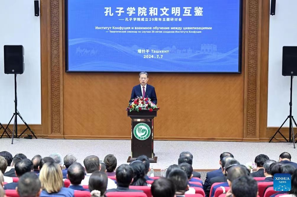 7月7日,在乌兹别克斯坦进行正式友好访问的全国人大常委会委员长赵乐际到访塔什干国立东方大学孔子学院,出席“孔子学院和文明互鉴——孔子学院成立20周年主题研讨会”开幕式并致辞。赵乐际在致辞中强调,要加强中外语言文化交流合作,搭建友谊桥梁,促进民心相通。